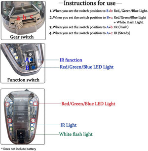 - 2. Functions Include: Visible LED Light + IR + White Flash Light, Can Provlde Flashling or Constant Light. Color: Green Light+IR / Red Light+IR/Blue Light +IR. *Attention: IR Lights are Invisible and Shallow Lights, Need to use Night Vision Device to Fully Display.